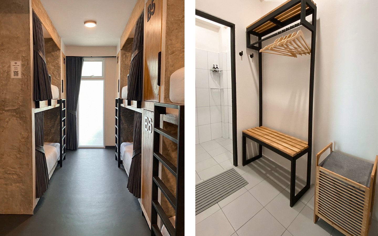 Our new mixed 6-bed dorm room. Includes privacy curtain, outlets, reading light, locker, and private bathroom.